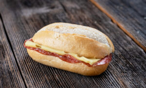 Sestavine: polnozrnato pekovsko pecivo (PŠENIČNA moka, RŽENA moka, voda, sol, kvas, LANENO seme, SEZAMOVA semena, OVSENI kosmiči, sončnična semena, sredstvo za obdelavo moke: askorbinska kislina, SOJA, JEČMENOV slad), klobasa; piščančja prsa v ovitku (piščančje prsi (78%, voda, kuhinjska sol, dekstroza, stabilizatorji (trifosfat, karagenan), začimbe, modificiran škrob, rastlinske vlaknine, antioksidant (Na-aritrobat), arome, repično olje, ekstrakti začimb, konzervans (Na-nitrit), lahki namaz (vsebuje JAJCA, MLEKO), SIR Dimar (pasterizirano MLEKO, jedilna sol, sirišče, sirarske kulture, aroma dima (pridobljena z bukve), paradižnik, solata.