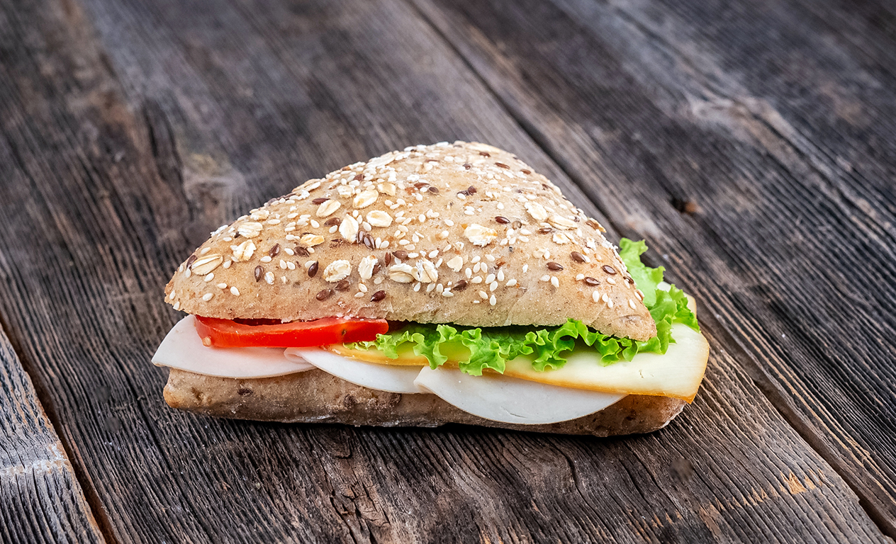 Sendvič Polnozrnat trikotnik, lahki namaz, piščančja prsa, dimljen sir, solata in paradižnik