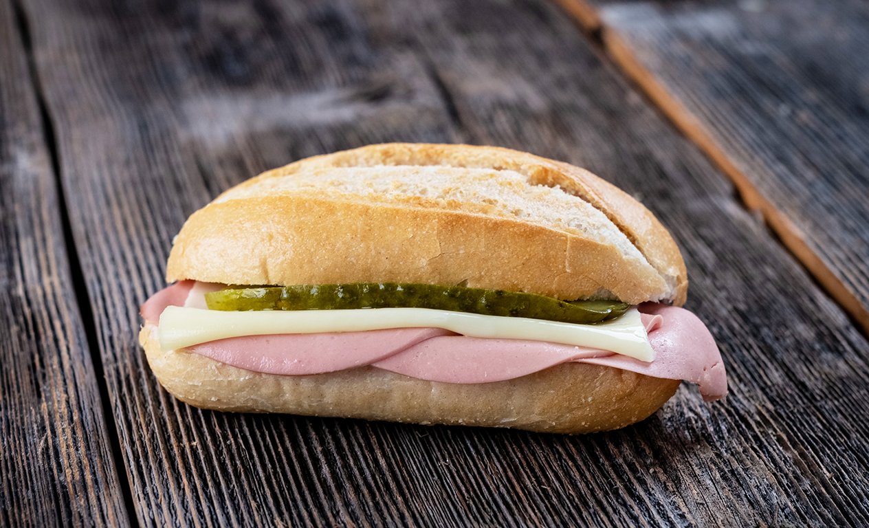 Sendvič s piščančjo posebno klobaso, sirom in kislim kumaricami